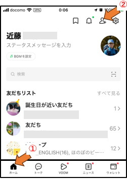 ①「ホーム」をタップして、LINEのホーム画面を表示し、②「友だち追加」をタップ(以下 iPhone の例)